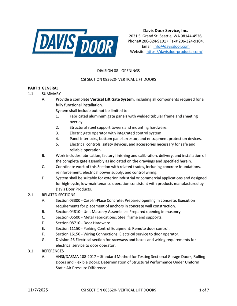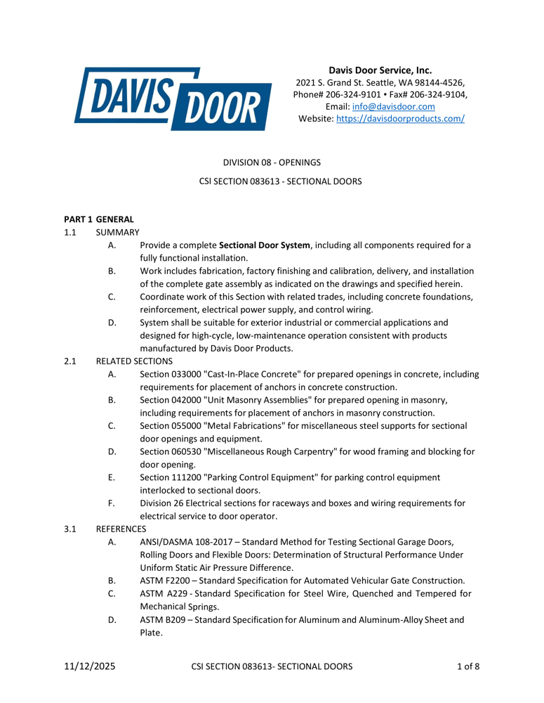 Davis Door will send a factory representative to assist in the installation and commissioning of the door.